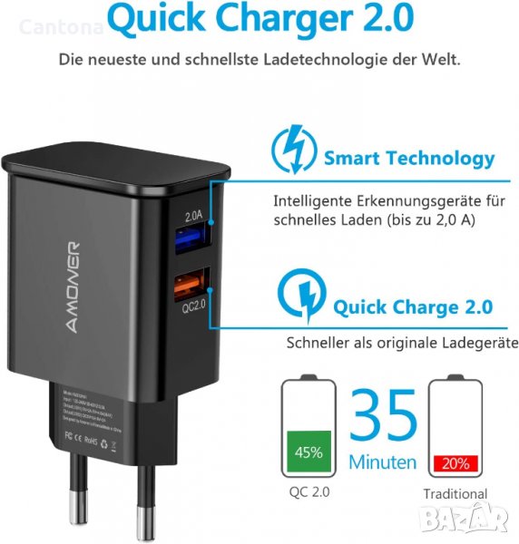 Amoner 25W 2-портово aдаптивно бързо зарядно устройство, с кабел USB C