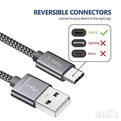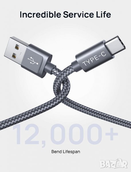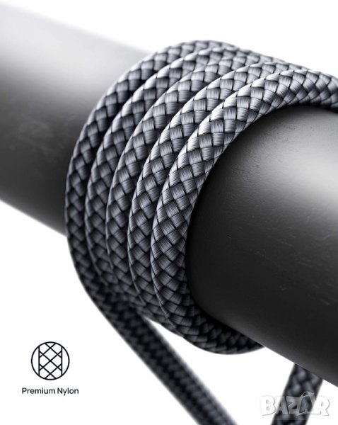 - Здравите влакна, най-гъвкавият, мощен и издръжлив материал, увеличават силата на опън с 200%. Може да издържи 10 000+ теста за огъване. Първокласният алуминиев корпус прави кабела по-издръжлив, кабелът с найлонова оплетка тип c добавя допълнителна издръжливост и не се заплита.
