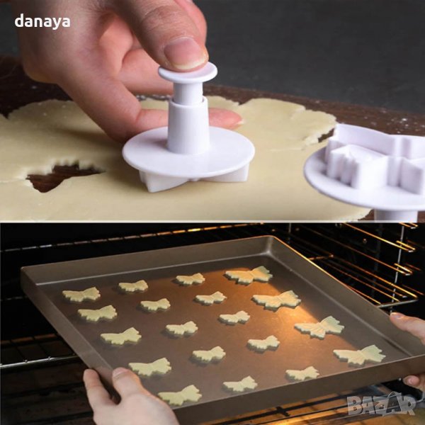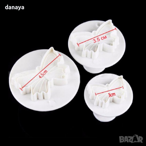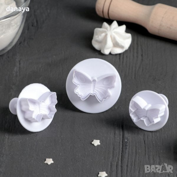 Комплект от 3 броя формички за сладки пеперуди. Всеки резец е с различен размер. Формите са с избутващ механизъм и са идеални за работа със захарно тесто, марципан, тесто за бисквити, меденки и др.