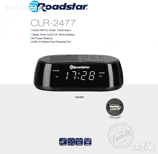 Радио будилник Roadstar CLR-2477 с LED дисплей, две алармени времена и таймер за заспиване, USB връзка, памет за 20 станции, радио тунер, черен