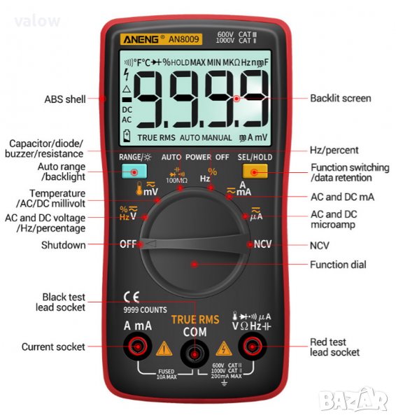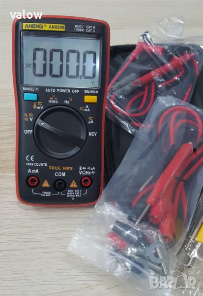Мултицет Aneng AN8009. Освен стандартните величини мери и температура, търсене на електрическо поле (NCV). True RMS. Голям дисплей с подсветка, 9999 count. Компактни размери, В комплекта са включени допълнителни сонди и щипки, термо датчик и калъфче.
