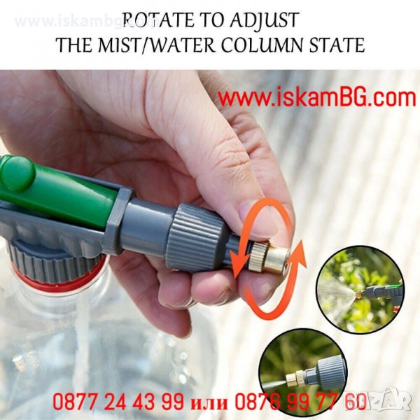 С други думи, прикрепете пулверизатора към всяка бутилка с резба (бутилка с вода, бутилка с разтвор срещу вредители и др.) и грижата за растенията ще бъде улеснена.