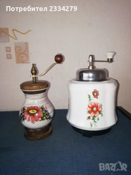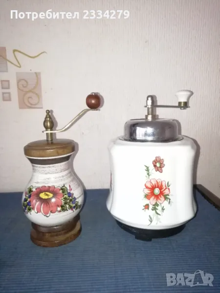 N:3 Стара немска кафемелачка, изработена от порцелан дърво, метал с размери: 19х9см., цена 19€. N:4 Другата е немска машинка от 50-те години, универсална за подправки, ядки и плодове и зеленчуци, цена 8€. Може да ползваш и декорираш кухня,кафене-заведение,витрина,битов кът. Колекция.