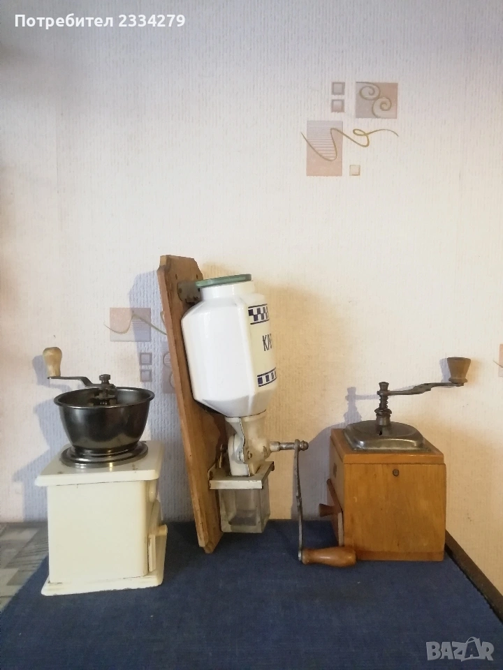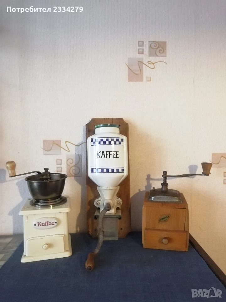 N:3 Стара немска кафемелачка, изработена от порцелан дърво, метал с размери: 19х9см., цена 19€. N:4 Другата е немска машинка от 50-те години, универсална за подправки, ядки и плодове и зеленчуци, цена 8€.; N:5 стара ръчна мелачка на кафе, дърво, метал, порцеланова табелка, размери 21х13см., цена 15€.; N:6 стара ръчна кафемелачка, дървена ,,Linbrock" Германия, размери 20х17см., цена 17€. Може да ползваш и декорираш кухня,кафене-заведение,витрина,битов кът. Колекция.