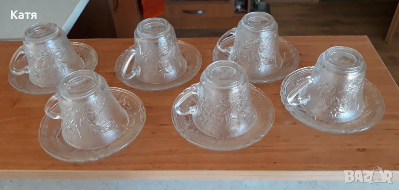 Стъклен сервиз чаши и чинийки за кафе - 6бр. Релефно стъкло. Чашите са с височина - 6.5см и диаметър - 8.5см. Вместимост - 150мл. Произведен в Индонезия. Без забележки. Цена за целия сервиз - 25лв.
