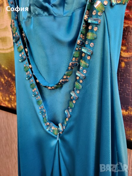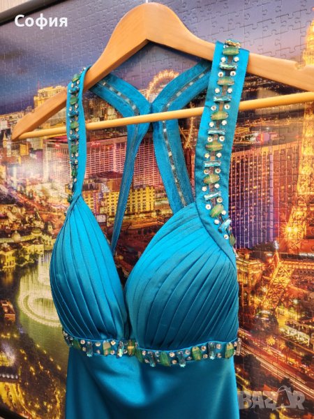 Невероятно ефектна и елегантна абитулиентска рокля, в лъскаво синьо. Роклята е маркова, закупена от дизайнерска къща Romantica Fashion. Марката е Mori Lee by Medelin Gardner. Носи се без сутиен, има подплънки за бюста. Множество камъни и декорация. Има няколко петна, които почти не се забелязват и с химическо чистене най-вероятно могат да бъдат премахнати.