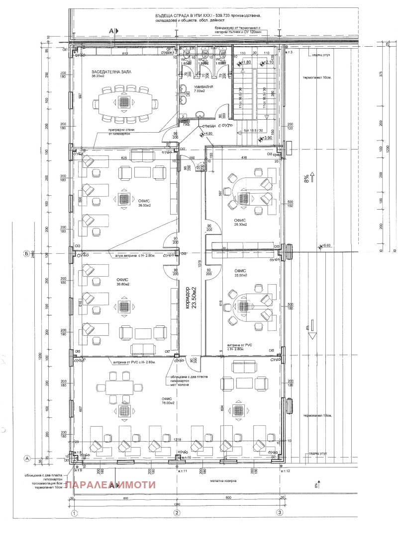 Имаме удоволствието да предложим чудесен имот представляващ самостоятелен обект в сграда със статут на офис. Обекта заема административната част от производствена сгпада в ЖК 'Тракия'. Изключително комуникативно място бърз достъп до всички важни пътни артерии на гр Пловдив. В района има спирки на градски транспорт. Обекта има функционално разпределение на пространството и площа му е разпределена м-ду обособените офис помещения както следва : СТЪЛБИЩНА ПЛЩАДКА НА НИВО ДВЕ 14 кв.м. ОБСЛУЖВАЩ КОРИДОР 24 кв.м. ЗАСЕДАТЕЛНА ЗАЛА 36 кв.м. ТОАЛЕТНА 10 кв.м. ОФИС ПОМЕЩЕНИЯ 5 на БРОЙ със съответно квадратури както следва 38-26-37-26-78 кв.м. В района има техническа възможност за ползване на оптичен интернет с високо качество.Обявената цена е без ДДС. Имота е подходящ за следните дейности :