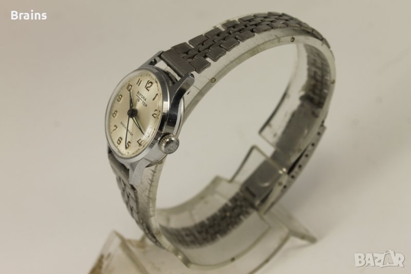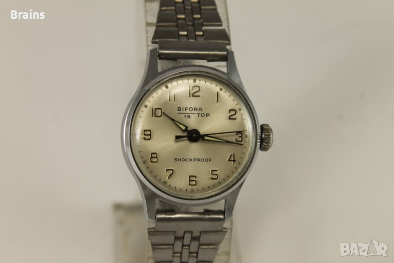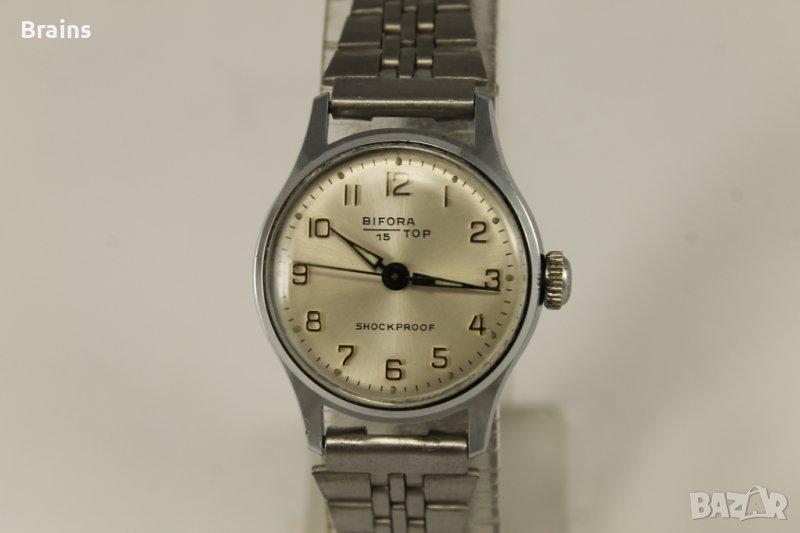 Колекционерски Швейцарски дамски ръчен часовник BIFORA TOP от 60-те години. Часовника работи отлично. Перфектно състояние. Швейцарска машина B 91/1 със 17 камъка. Оригинална винтидж стоманена верижка. Размери: Каса 26x30 mm, Циферблат 21 мм, дебелина 8 мм.