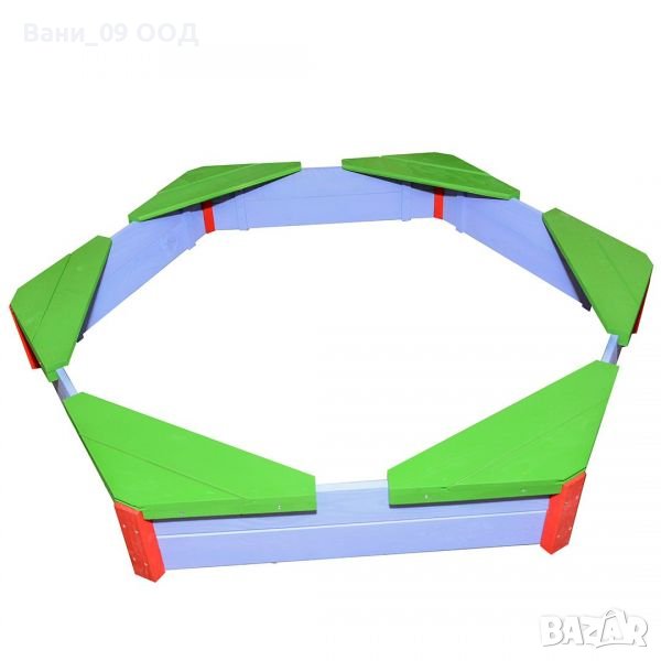 Изработен е изцяло от естествена иглолистна дървесина, а конструкцията му е здрава и стабилна. Във всеки един ъгъл е прикрепена седалка, където децата да поседнат по време на играта. Пясъчникът е боядисан със син и червен цвят, а седалките са в зелен цвят. Боята, която е използвана при боядисването му, е водоразтворима и напълно безвредна за околната среда и за хората, Благодарение на нея, шестоъгълният пясъчник е устойчива на атмосферни влияния.
