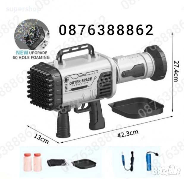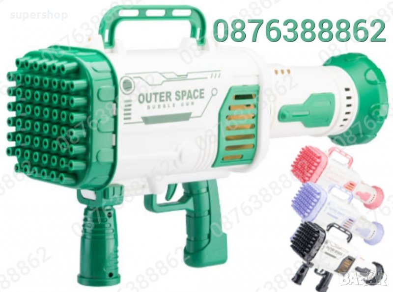 ОСОБЕНОСТИ:Автомат за водни балончета има доста мощен двигател, захранващ се от литиева батерия и 64 дупки от които излизат над 2000 мехурчета в минута.