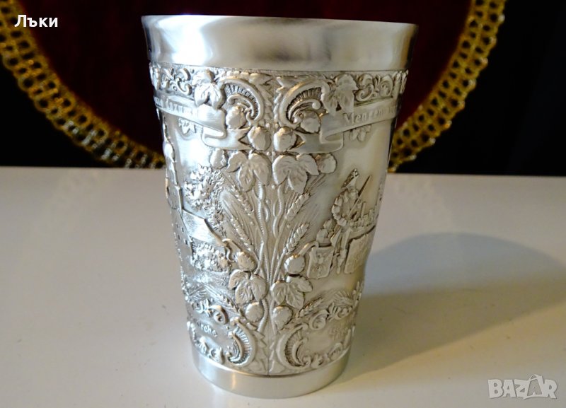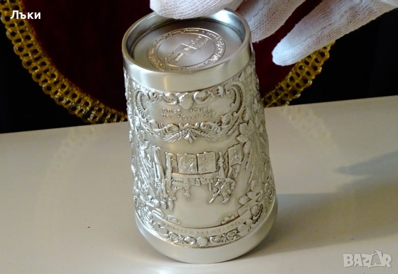 95% калай и 5% сребро,маркирана.Декорирана с красиви релефни картини за Мъжете