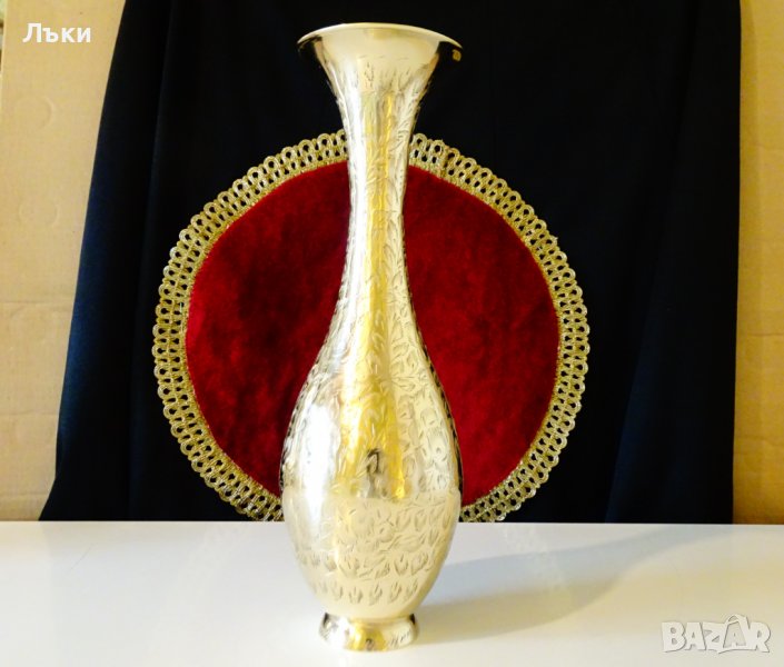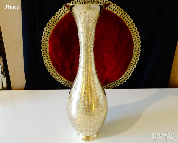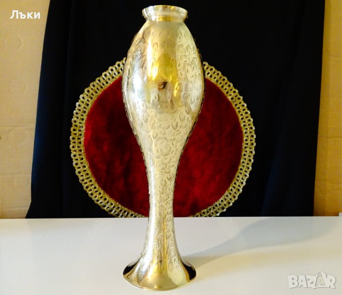 масивен бронз,маркирана за производител.Красиво декорирана с релефно гравирани цветя и орнаменти.Има класически дизайн и ослепителен златен блясък.Височина 28 см.,диаметър 10 см.,тегло 450 гр.