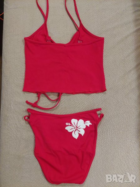 Продавам нов дамски червен бански танкини, от две части, немски, марка ТСМ. На горнището и долнището има бяло цвете. Не е обличан, но когато махах етикетите, без да искам срязах и част от плата отзад на горнището. Това е единствената забележка. Показано е на снимките.
