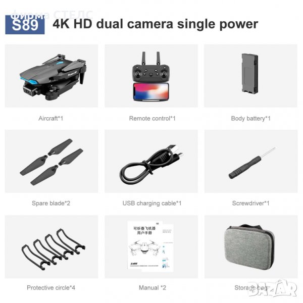 Дронът STELS S89 ви предлага невероятно летателно изживяване благодарение на най-добрите технологични характеристики: висококачествена 4K, HD камера, 3,7 V и 1800 mAh батерия, която ви осигурява 12-минутен полет, безчеткови двигатели, които осигуряват безопасен, ефективен полет с дълъг летеж, достигащ разстояния до 100 метра и предаване на изображения до 100 метра с летателното устройство.