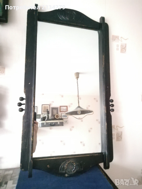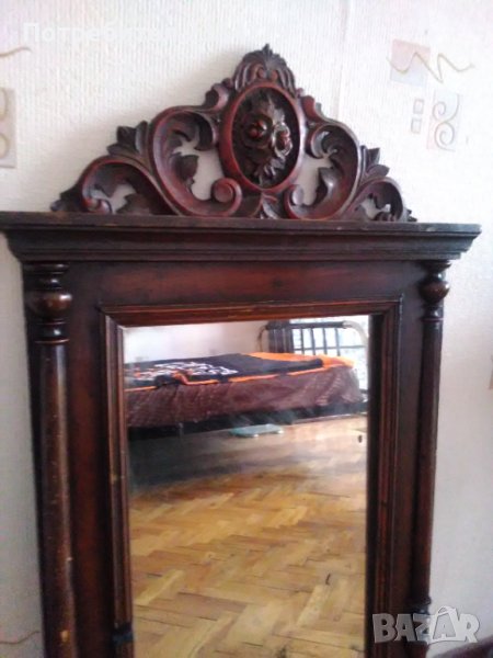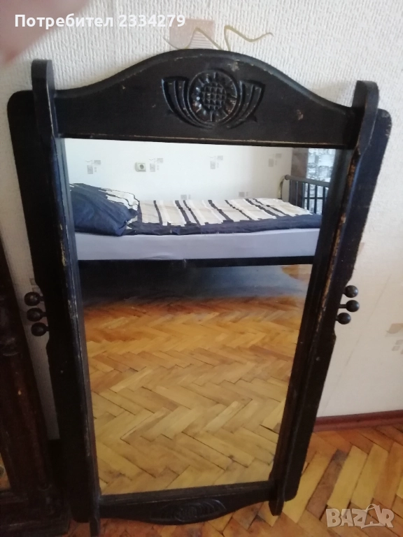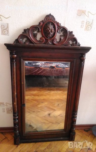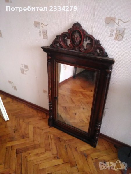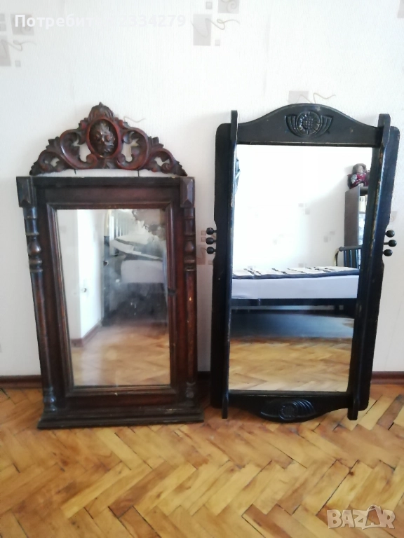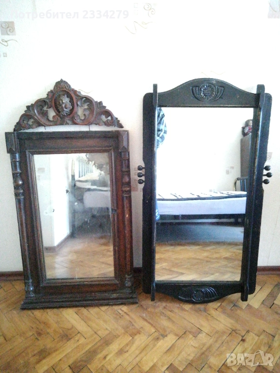 N:1 Старо огледало с дървена рамка масивна цялата в орнаменти. Размери: 85х55см.,дебелина 7см. В единият долен край на стъклото има оксидация от времето,автентичен белег.; N:2 старо огледало поне 100 годишно в много добро състояние, ръчно изработено от дърво и орнаментирано с дърворезби в долният и горният край, отстрани има по два щифта за закачане на пешкири хавлии,кесета и други.