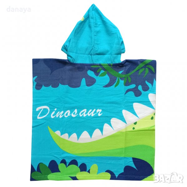 Плажно пончо за деца в супер свежи цветове. Пончото е с принт на “страшен” динозавър. Удобен плажен халат с голяма качулка и атрактивен принт, който впечатлява децата. Супер мекичка детска хавлия пончо за малки палави динозавърчета! Подходящо за деца до 10 годишна възраст или височина на детето до 130см.
