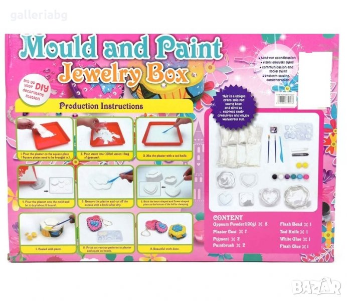 Комплектът съдържа: шаблон за отливане, пакетчета гипсов прах, боички 7 цвята, четка за рисуване, брокат и др.