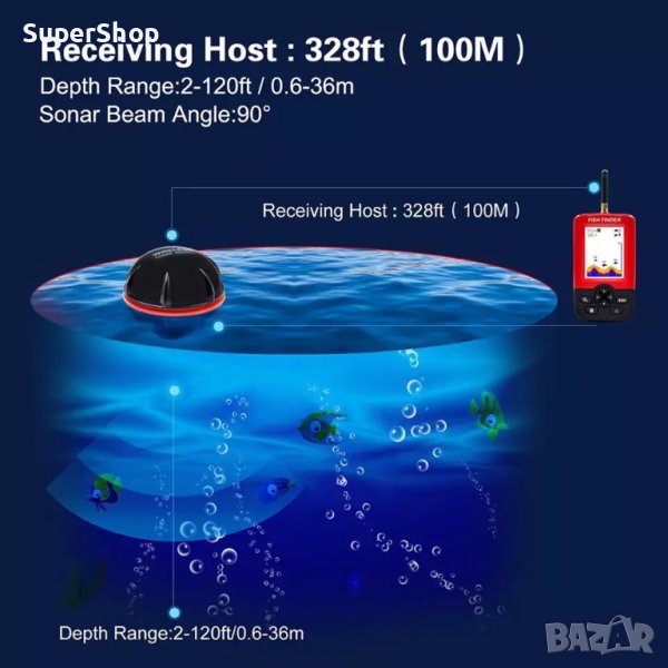 Дълбочината, която ще може да измерете е до 36 метра. От своя страна обхватът на безжичен приемник е до 100 метра с работна честота на сонара 125KHZ. Регулирането на ниво на чувствителност от 1 до 20, спомага лесно да откриете позицията на рибата. Моделът е приложим във всички видове водни басейни като океани, морета, езера, реки и т.н. Може да работи безпроблемно на температура от -20 до 70°C , което го прави подходящ за сладка, солена или ледена вода.