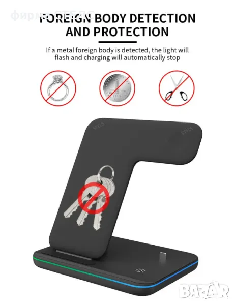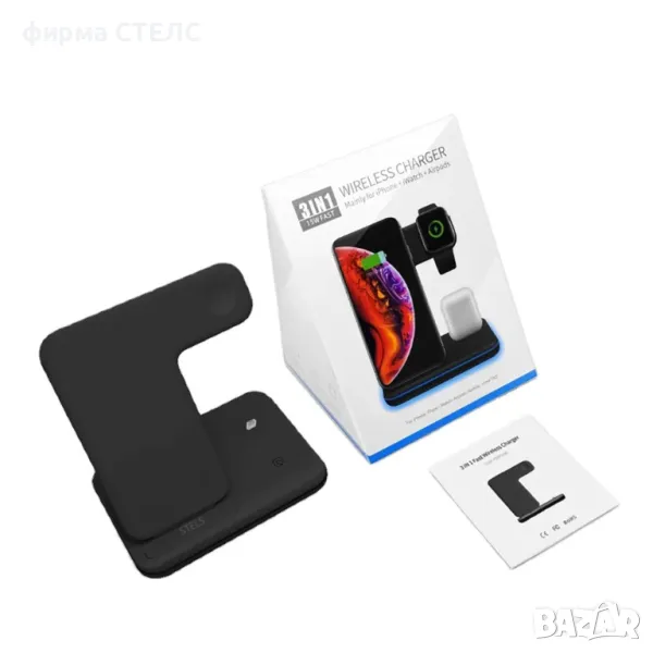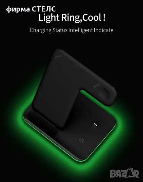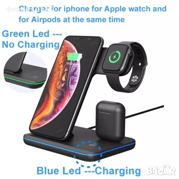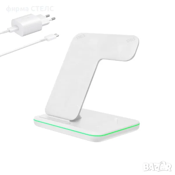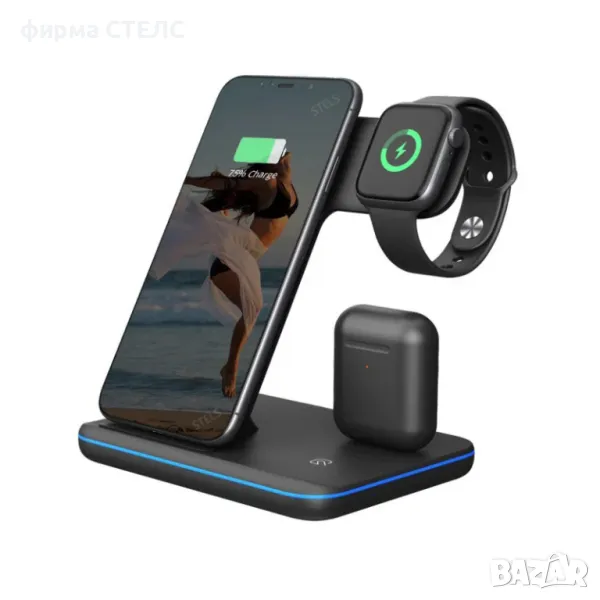 Безжично зарядно устройство STELS V9 Pro за едновременно зареждане на телефон, Apple Watch и AirPods. Отлично решение за дома и офиса с елегантен дизайн и практично приложение.