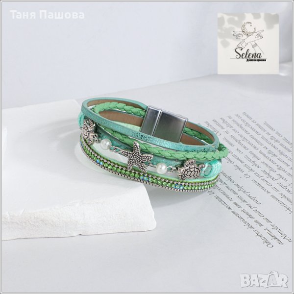 кожена многослойна гривна с метални морски елементи и метална закопчалка