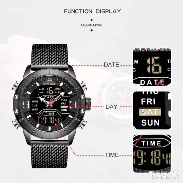Допълнителни функции - Показва дата, Месец, Ден от седмицата, Показва 24 ч, Хронометър, Аларма, Подсветка