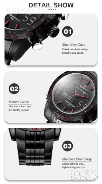 Корпус и циферблат от неръждаема стомана. Стъклото на циферблата е устойчиво на надраскване