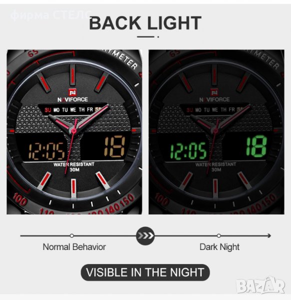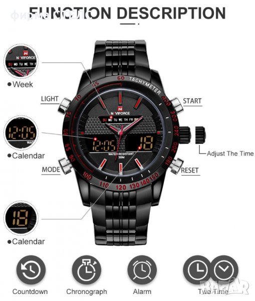 Допълнителни функции - Показва дата, Месец, Ден от седмицата, Показва 24 ч, Хронометър, Подсветка