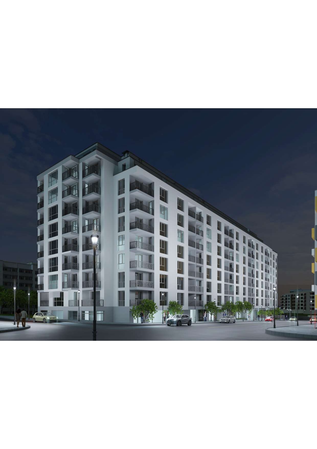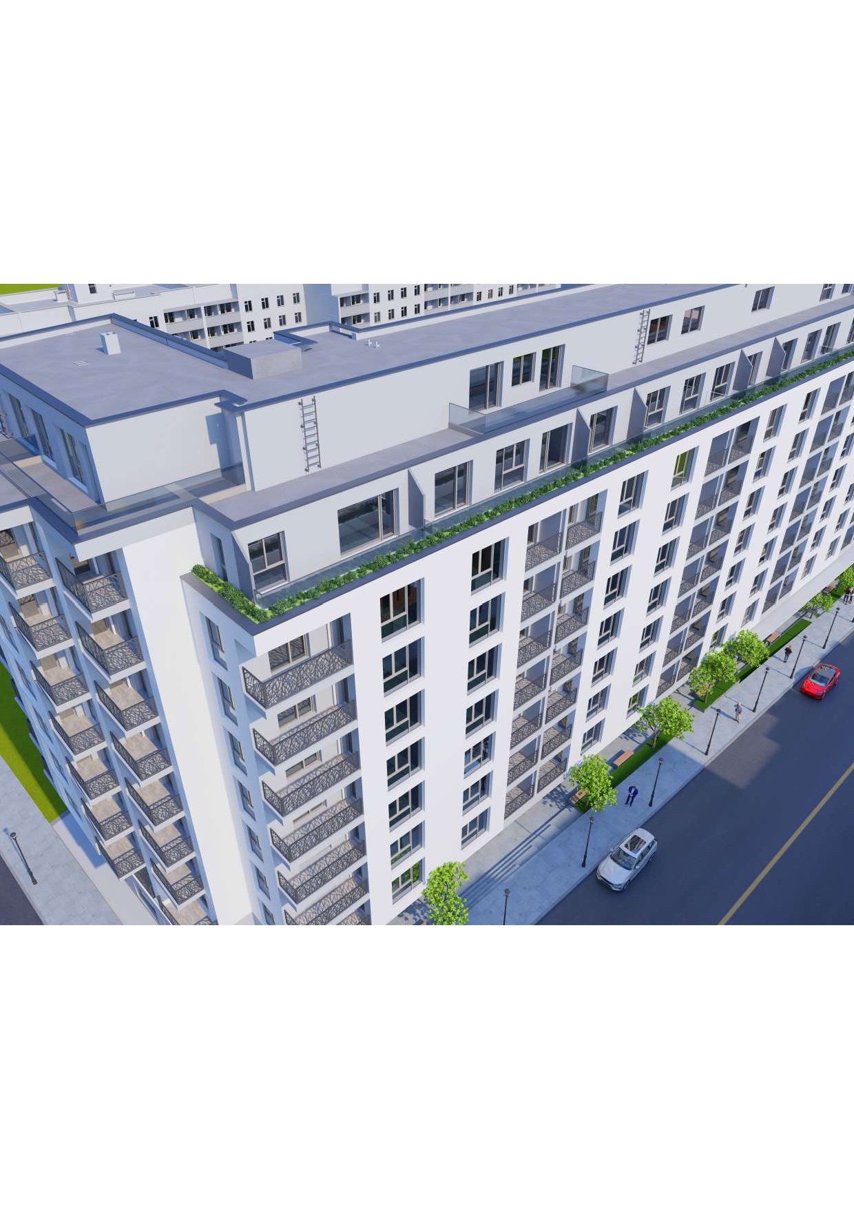 Комплекс от затворен тип с контролиран достъп и озеленен вътрешен двор с алеи, пейки и градинско осветление.
