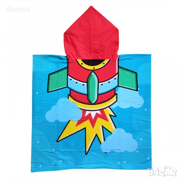 Плажно пончо за деца в супер свежи цветове. Плажна хавлия, тип пончо с принт на излитаща ракета. Удобен плажен халат с голяма качулка и атрактивен принт, който впечатлява децата. Супер мекичка детска хавлия пончо за малки астронафти! Подходящо за деца до 10 годишна възраст или височина на детето до 130см.