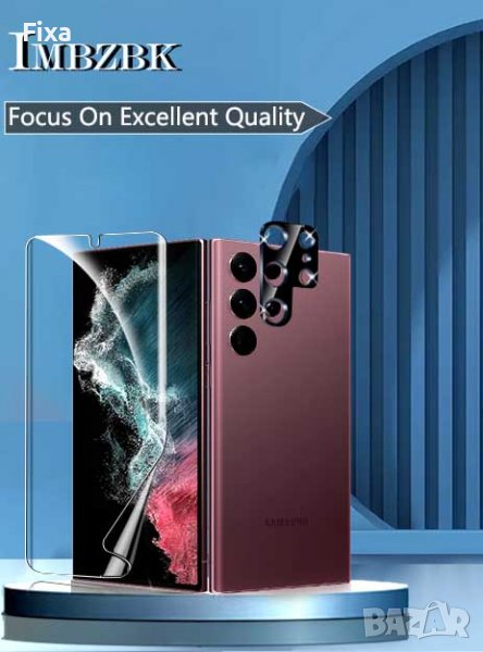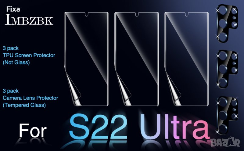 Продавам защитни аксесоари за SAMSUNG Galaxy S22 Ultra: 3 броя TPU протектора за екрана, и 3 броя предпазно стъкло за задната камера, на много известната марка "IMBZBK”