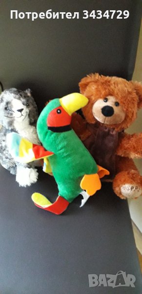 Плюшени играчки - не се различават от нови. 1. Коте - височина 20 см. Цена 3.00 лв. 2. Красив папагал - височина 23 см. Цена - 3.00 лева. 3. Щастливо меченце - височина 26 см. С разперени лапи /28 см/. Цена 7.00 лева. Трите заедно -12.00 лева.