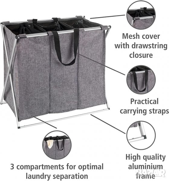 Колектор за пране WENKO Trio, стабилен кош за пране с капак и практични дръжки за носене,