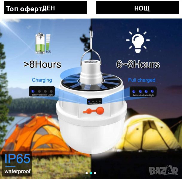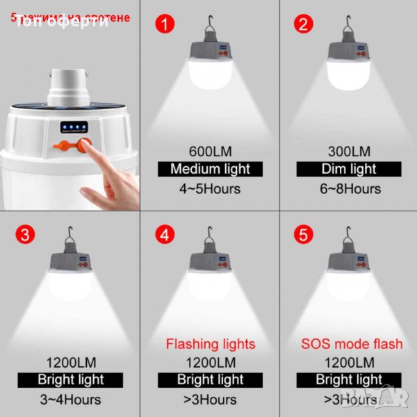 Къмпинг лампа с кука за закачане и 5 режима на светене. Мощна и удобна акумулаторна къмпинг LED лампа за закачане с вградени батерии и соларно зареждане през деня и USB кабел нощно време. Идеална е за къмпинг, за градина или ремонтни дейности.