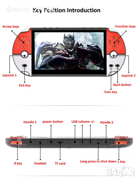 Преносима игра с голям 7.1 инчов цветен дисплей. TV Out - възможност за свързване към телевизор. Поддръжка на различни видове игри - 8/16/32/64 битови игри. MP3, MP4 плеър, четене на електронни книги и много други мултимедийни функции.