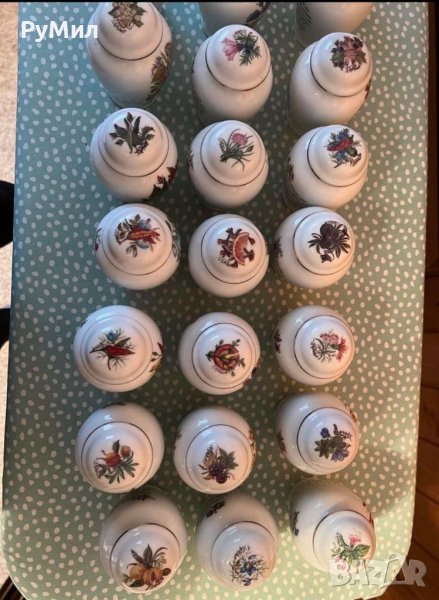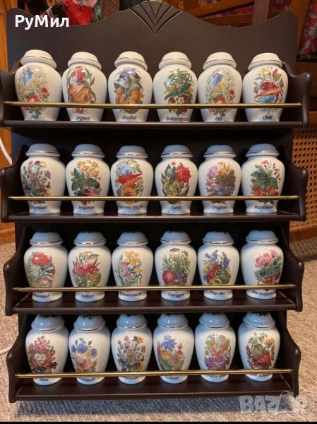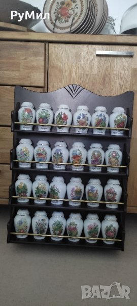 Продавам пълен комплект от 24 броя порцеланови съдове за съхранение на подправки с маркировка "The Crestley Collection" в комплект с оригиналната им етажерка. Размерите на етажерката са: височина-63,2 см/ дълбочина -10 см/ ширина 46-48 см. Етажерката може да се окача на стена или да се постави върху друга мебел. Етажерката и бурканите са в отлично състояние, без забележки, без следи от употреба. . Цената на комплекта е 660 лева.