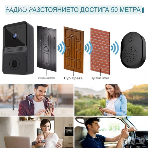 Благодарение на безжичната Wi-Fi технология, интелигентният звънец позволява гледане от разстояние и разговори с хората пред входната врата. Вграденият сензор за движение ви позволява автоматично да записвате видео, което след това може да възпроизведете на екрана на вашия смартфон.