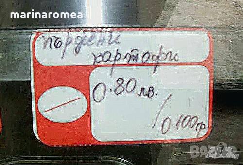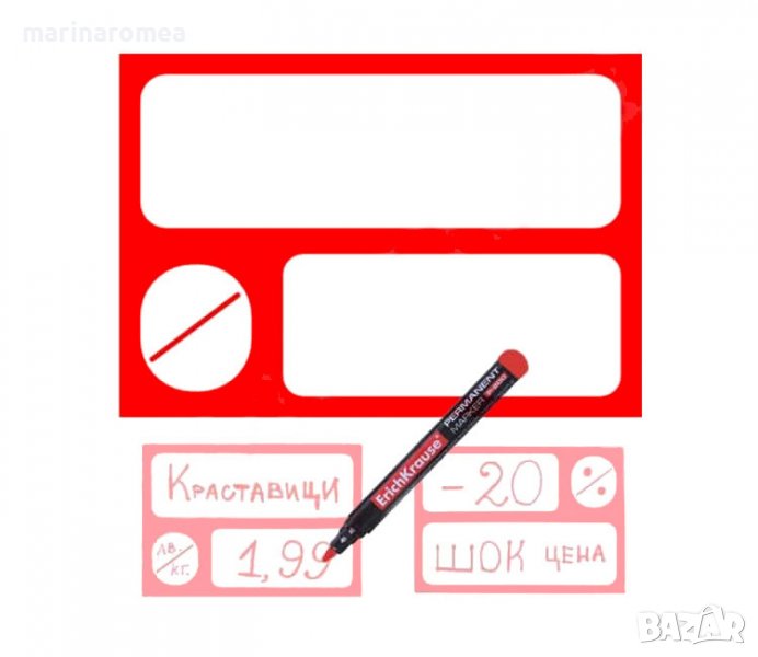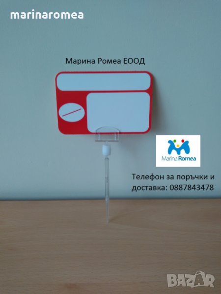Марина Ромеа ЕООД продава нови комплекти за ценово обозначаване на стоките в магазини.Представляват комплект от картонени етикети и пластмасови вилички. Служат за лесно, ясно и привлекателно представяне на допълнителна информацията за стоките и техните цени във всеки търговски обект. Чрез тях е лесно да покажете и бързо да подмените цените и информацията за продуктите. Идеални са за поставяне на щандови витрини за плодове и зеленчуци, сирена и кашкавали, месо и колбаси, риба и рибни деликатеси, хляб и хлебни изделия,салати, торти,деликатеси и др.