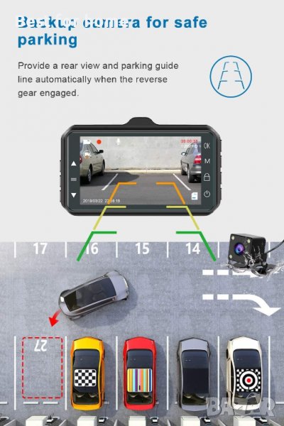 Този екран на дисплея на камерите автоматично ще показва пълен изглед отзад с насочващи линии за паркиране, когато е включена задна предавка на автомобила. Водоустойчивата камера за задно виждане ще ви помогне да паркирате колата си лесно и безопасно.