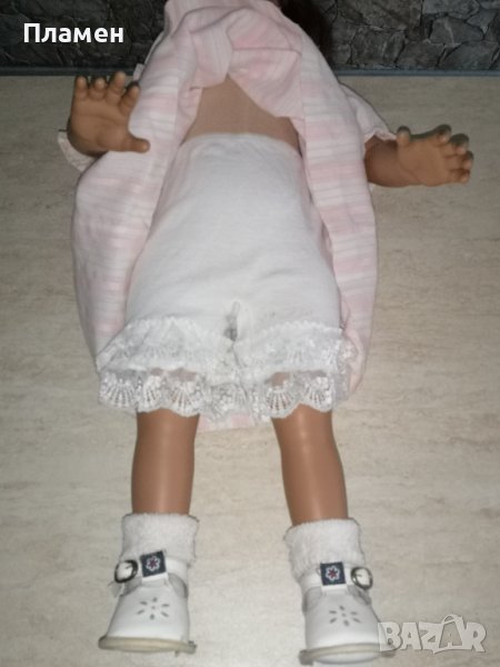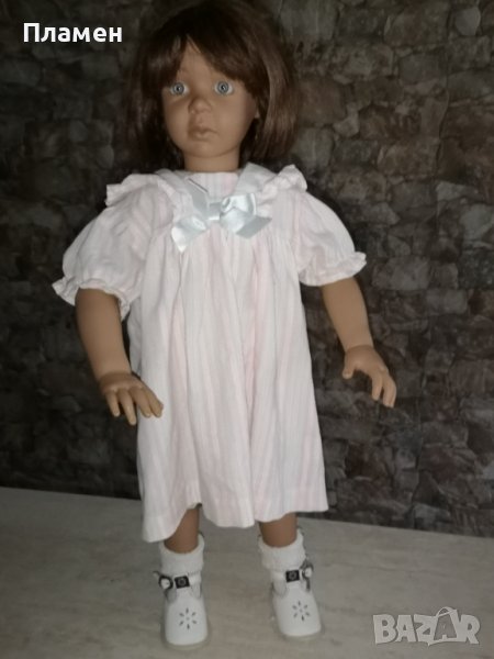 Меко тяло с вградена тел, което позволява различно позициониране, глава (подвижна е) и крайници - винил. Кулата може да стои права без нуждата от стойка. Състояние на куклата - отлично, на роклята -много добро. Обувките са естествена кожа-перфектни.