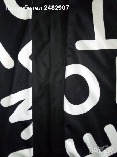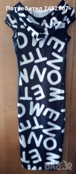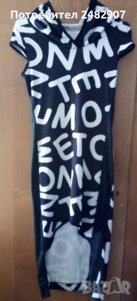 Нова дамска рокля/туника ликра - асиметрична, с качулка, къс ръкав и черни кантове от страни в черно и бяло, размер S. Ширина в раменете - 37 см, ширина под мишниците - 40 см, дължина на ръкава от рамото - 7 см. Дължина от деколтето до долу отпред - 62 см, дължина от рамото до долу отзад - 107 см.