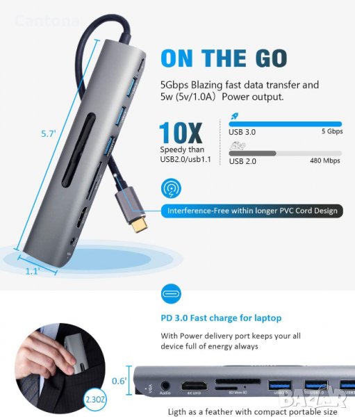 - USB C хъб 4K HDMI, 3 x USB 3.0 порта, порт за зареждане PD - 87 W, слотове за SD/TF карти и аудио. HDMI 4K@30Hz ви позволяват да свържете външен дисплей, за да се наслаждавате на HD видео/игри на големия екран. USB-C портът за захранване поддържа максимум 87 вата за зареждане, така че вашето устройство винаги е пълно с енергия. USB 3.0 портовете ви позволяват да свържете повече външни USB устройства. TF/SD карта ви позволява да синхронизирате файлове от камера/телефон към лаптоп.
