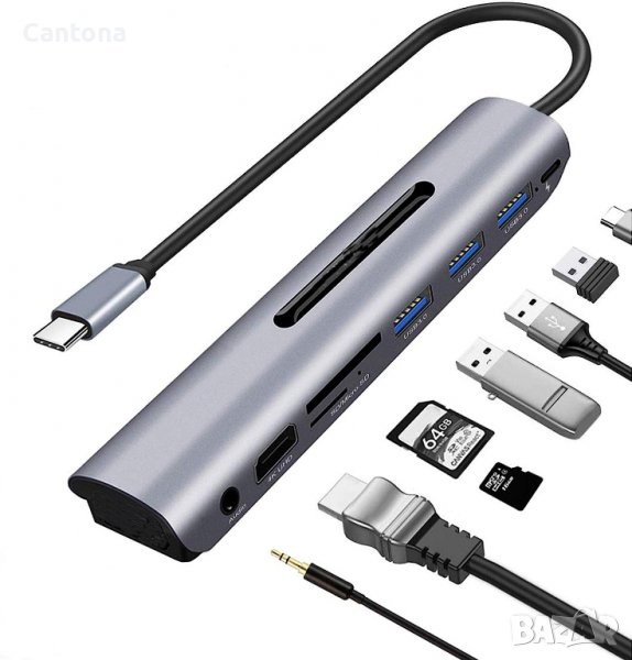 USB C Hub 8 в 1, 4K HDMI, 3xUSB 3.0, PD 87 W, Audio jack, SD/TF четец