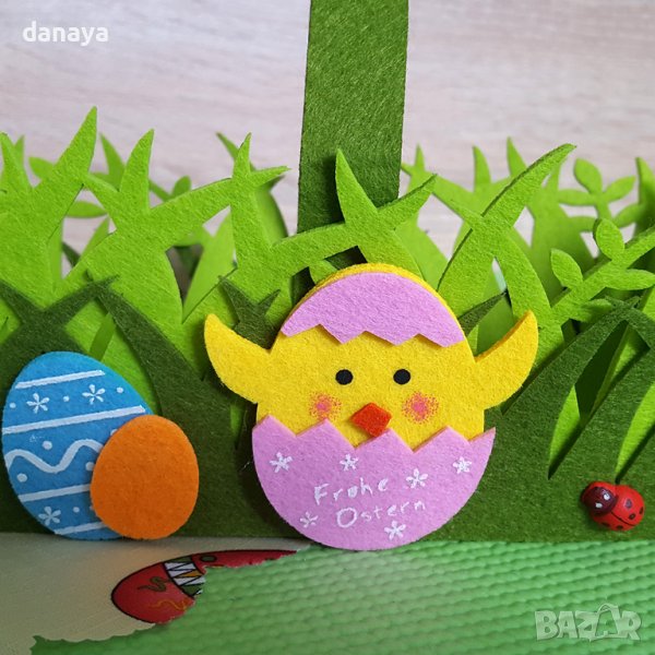 Великденска кошничка от филцов материал, декорирана с велесо пиле, великденски яйца, калинка и цветя. Декоративен панер в правоъгълна форма. Чудесна декорация за Великден!