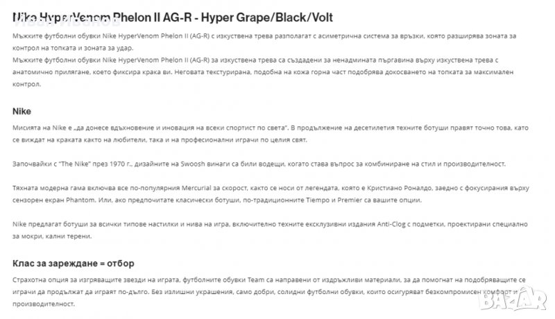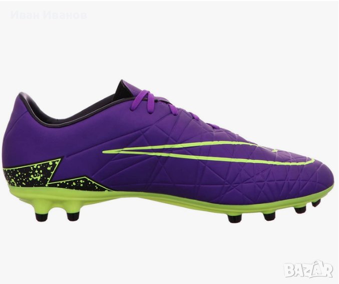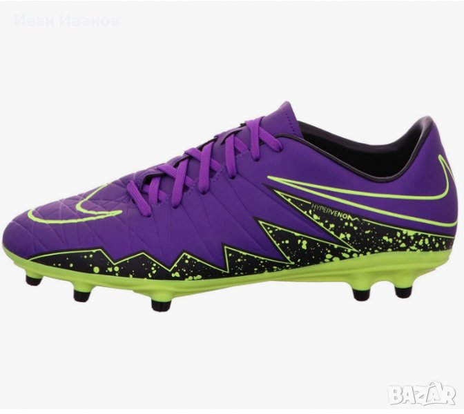 Nike Hypervenom Phelon II FG е изработен от мек и тънък горен материал, който осигурява отлично прилягане и благодарение на текстурираната повърхност също и за страхотно усещане за топката. Анатомичен дизайн за плътно прилягане, който позволява бързо движение. Асиметричната система за връзки увеличава контрола на топката и увеличава зоната на стрелба. TPU пластина за поддръжка и усещане за отзивчивост. Предварително оформена перфорирана стелка за омекотяване, което намалява натиска върху копчето. Stable Ground Cams (fg) са специално проектирани за използване върху естествени пасища.