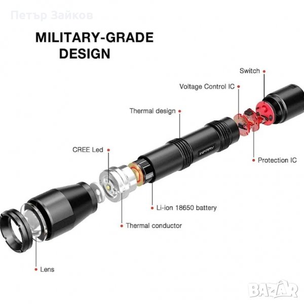 тактически фенер може да достигне 800lm, което осигурява невероятно мощен лъч и много по-ярък от нормалното фенерче. Можете лесно да фокусирате върху обекти на разстояние до 240 метра. Той е идеален за открито, туризъм,
