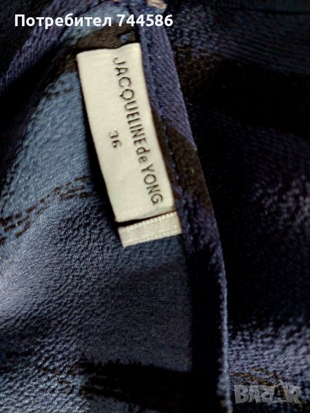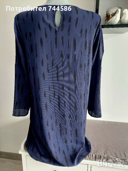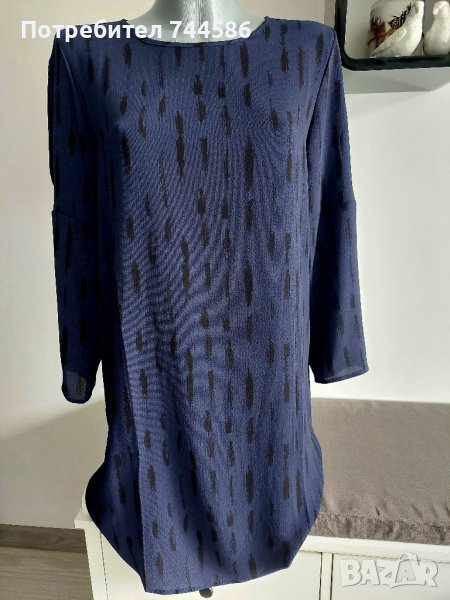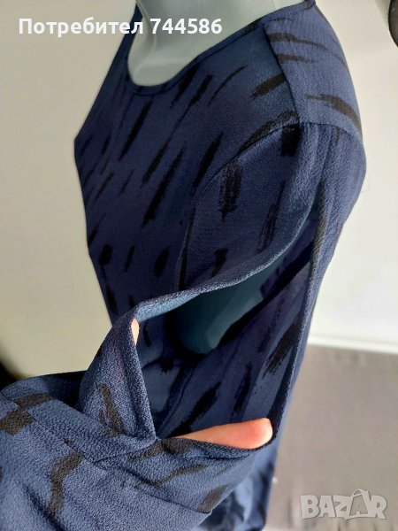 Роклята е много лека и е тъмно синя с черно.На ръкава има цепка,която стои много елегантно,на една от снимките се вижда.Отговаря на номер М,а ето и размерите:дължина:88 см,ширина на мищници:50 см на долу пада права.Изпращам с опция преглед и тест.