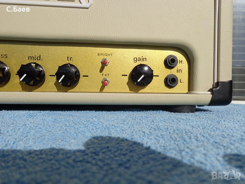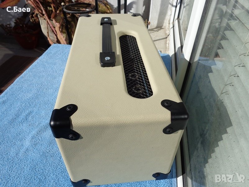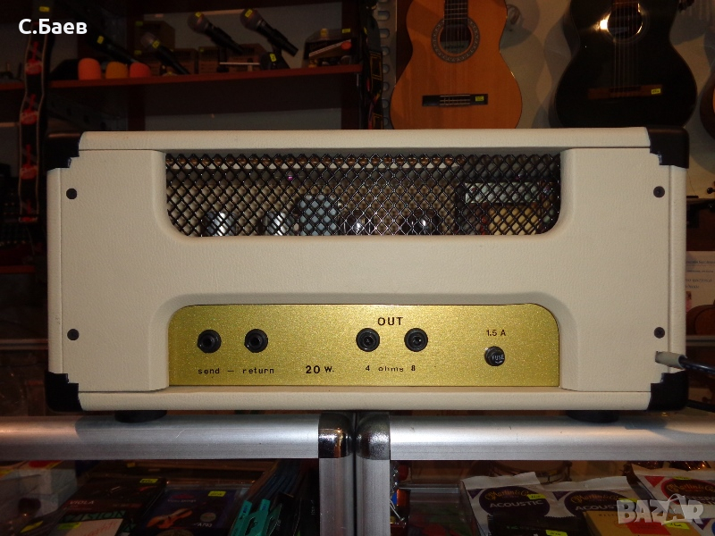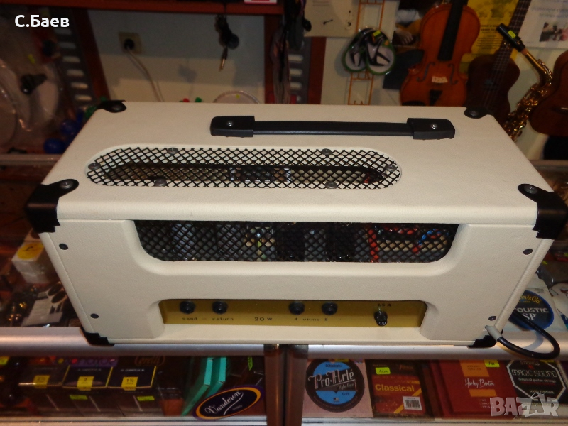 Нова 20 ватова лампова китарна глава.Крайни лампи 6V6 GTY - производство на американската фирма RCA . Предусилвателни 12АХ7. Възможностите и се виждат от предният и заден панел.Изходи за китарен бокс от 4 и 8 ома.Максимална мощност 25 вата.Прекрасно звучене на ел. китарата през тези глави,поради което са изключително желани в Англия и в Скандинавските страни.Размери - 46 см - 20 см - 20 см.Може да се види и пробва в Музикален център ТЕХНОСАУНД, Бургас,ул. Морска 40.Информация на тел. 0888 66 58 73. Цените са без аналог и не се договарят.Гаранция - 2 години.