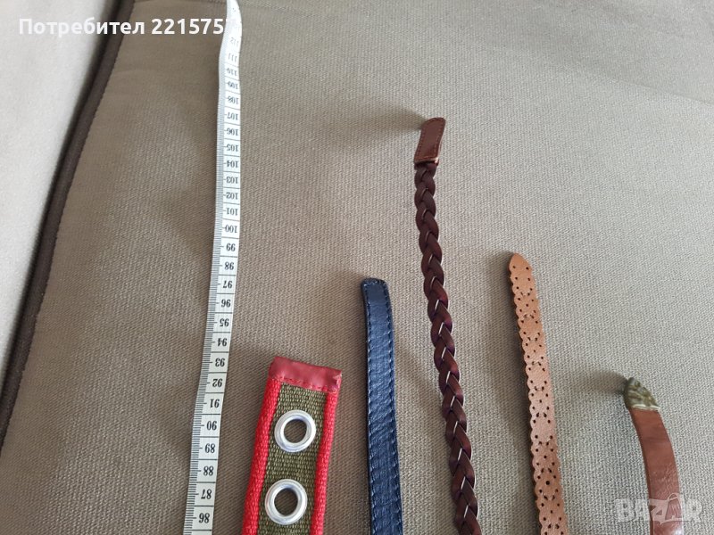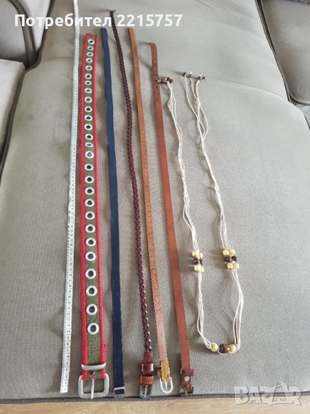 1)Широк ластичен колан, с цип. Кафяв. Цена 10лв...................................................................................................................2)Широк кожен колан. Ластичен. Цена 15лв..................................................................................................................3)Тъничек, марков колан. Нов с етикет-Милано. Бледо-розов. Дълж. до първа дупка 84см. Цена 15лв...................................................................................................................4)Колан, Соло Сопрано. Нов с етикет. Дълж. до първа дупка 84см. Цена 10лв....................................................................................................................5) Всички останалите на 3лв. Размери: зелен с червени кантове-91см, тъмно син-98см(продаден), кафяв-плетен 110см(продаден), кафяв на дупки-98см, светло кафяв–95см до послед.дупка 84см.
