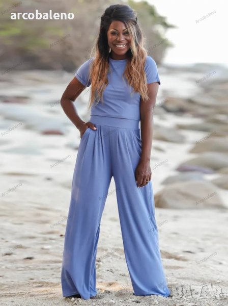 Едноцветна дамска тениска с кръгла яка и къс ръкав + панталон от две части
