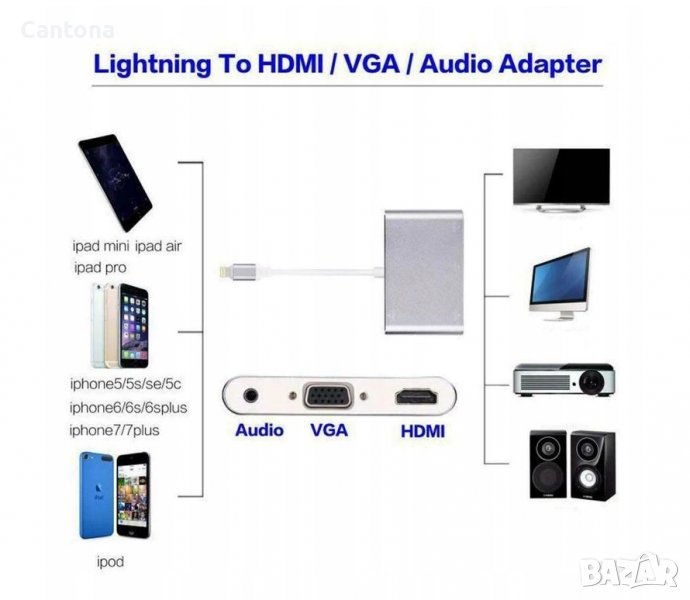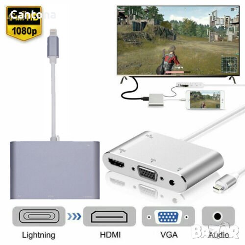 Свържете HDMI или VGA порта към съответния интерфейс на телевизор, проектор, монитор, той ще поддържа както аудио, така и видео изход едновременно. ВАЖНО: Също така поддържайте HDMI и VGA дисплей едновременно, по-добре от повечето други Lightning 8-пинови HDMI / VGA изходи заедно с адаптери.